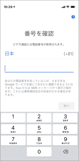 「番号を確認」の表示が出たら、お使いのスマートフォンの電話番号を入力し、次へのボタンを押します。
