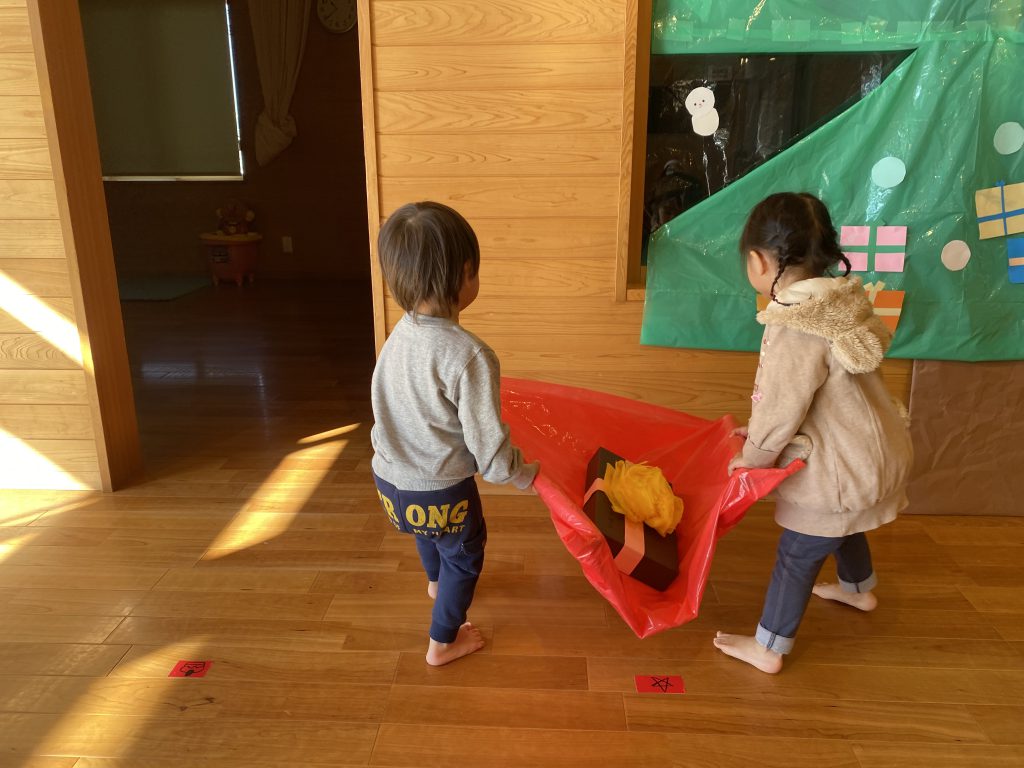 サンタさんになりきった子供たちが、プレセントを運びモミの木に飾り付け✋”みんな上手に飾り付け出来ていますね(*´▽`*)