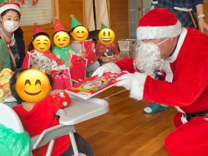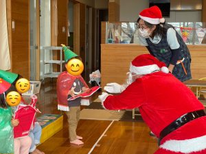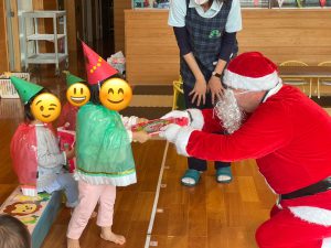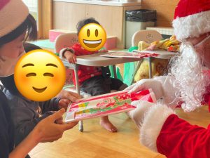 託児所でクリスマス会🎄をしました。 おやつ🍰を食べて、みんなで歌をうたいます🎵 すると、託児所にすてきなお客さまが来ました👀 \ メリークリスマス🎅!! / サンタさん🎅の登場にみんなびっくり! 1人1人にプレゼントを渡してくれました🎁✨ たくさんのプレゼントをもってきてくれたサンタさんに、 託児所からもお返し🎁を渡しました❤ 最後にみんなで写真撮影📷✨ サンタさん、ありがとうございました🥰