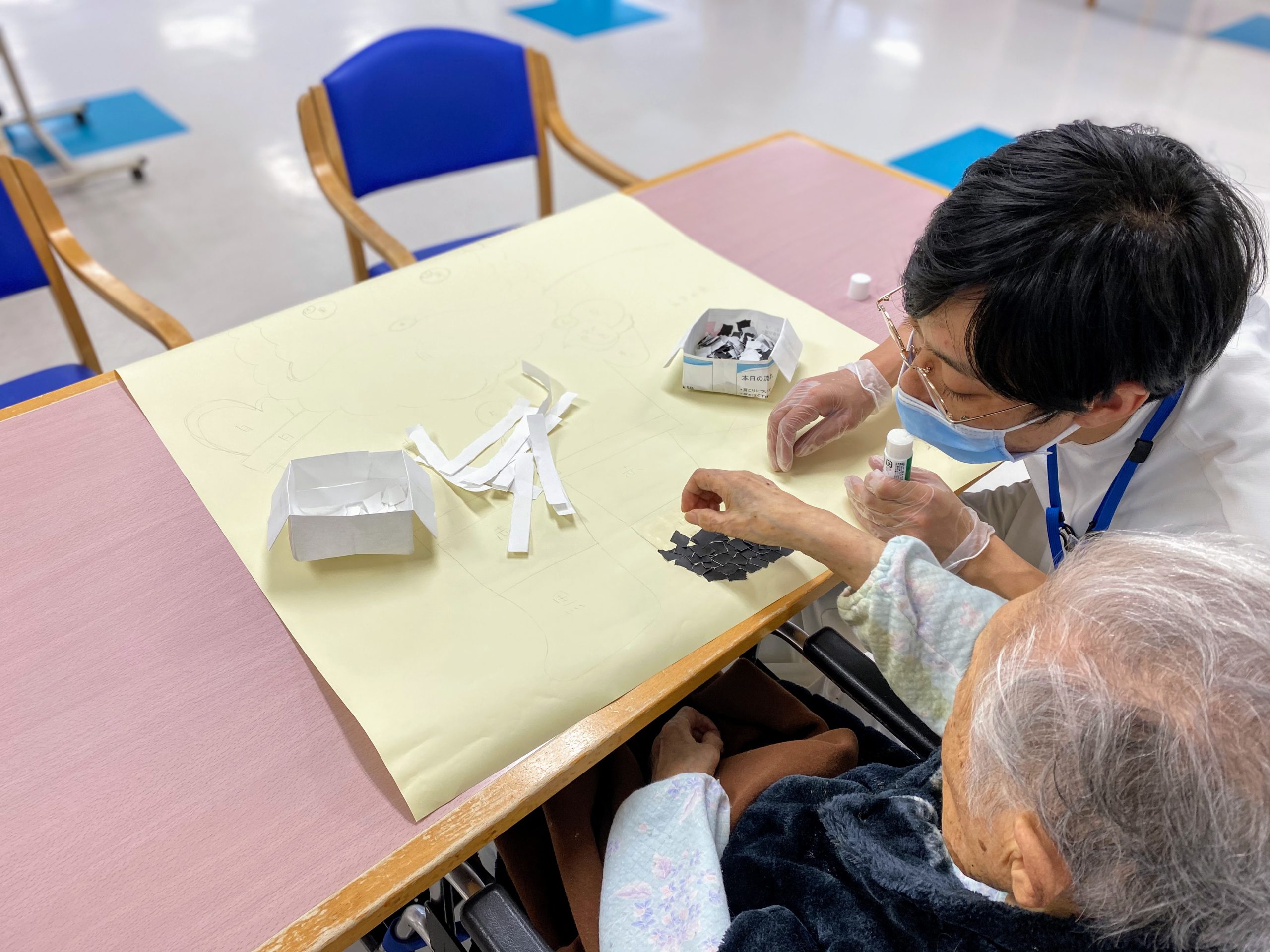 今回も、大きな紙にちぎった折り紙をペタペタ✋何やら新しい作品が作られているようです📷✨