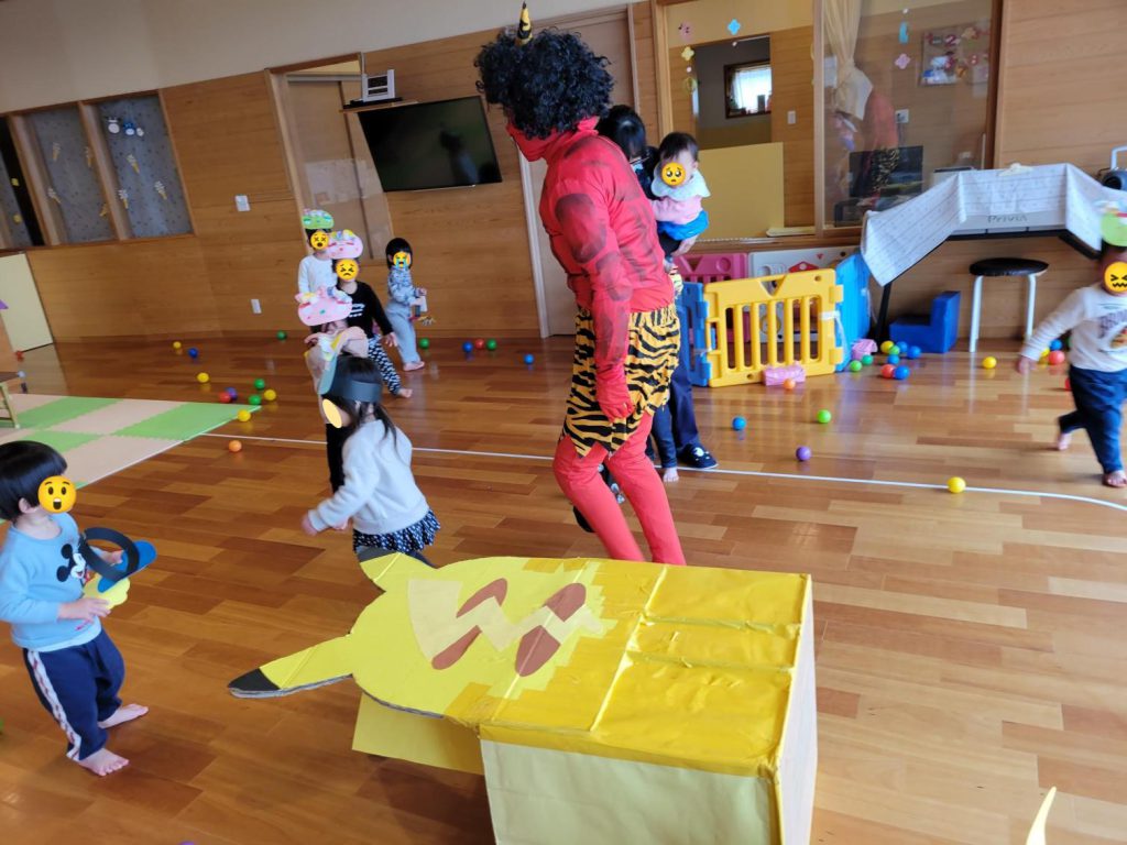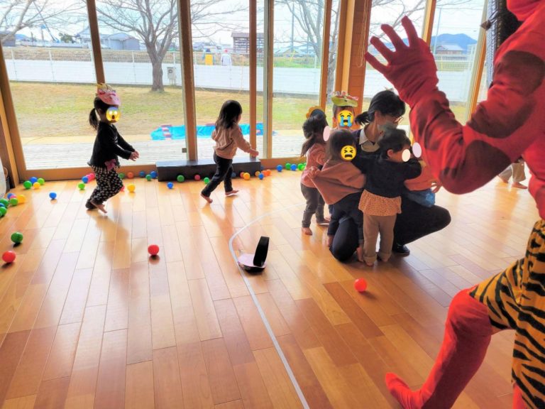 託児所でも節分のイベントを行いました✨ みんな、自分で作った鬼のお面をつけて準備ばっちり! ボール入れゲーム🙌 落ちているボールを拾って鬼の口にポイ! たくさん上手に入れることが出来ました😄 鬼の登場👹 きゃー!怖いよ~ 先生助けて~! みんないっぱい泣いていっぱい逃げ回りましたが、最後は先生と協力して無事に鬼退治! また一つ、子どもたちの良い思い出ができました😊