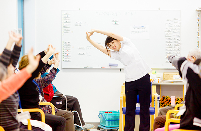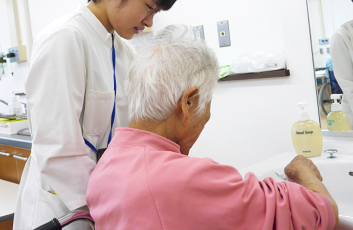 トイレや更衣、歩行など、日常生活の中で介助が必要な動作について、リハビリスタッフがピンポイントで専門的に関わります。個別・集団リハビリテーションに加え、一人ひとりに必要な動作へ的を絞ったこの取り組みは、目標とする動作の早期獲得を可能とし、退院へと導きます。