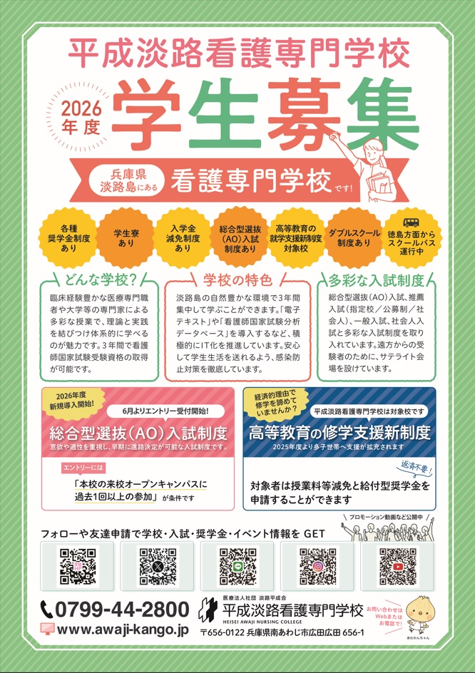 平成淡路看護専門学校では、2026年度入学の学生募集をおこなっています。